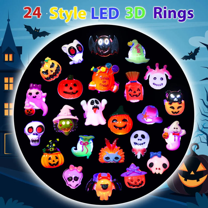 - 👻Light Up Toys Set: 42PCS Halloween LED flashing toys set including 24 style rings, 6 style necklaces,6 style bracelets,6 style brooches. All toys are filled in an exquisite color box. They are designs with different Halloween theme patterns(no repeat) include pumpkin, ghost, spider, bat, witch, skull, pirates, bones, ghosts etc.Boys and girls can choose shapes they want, meet different preferences, provide days of pleasure!