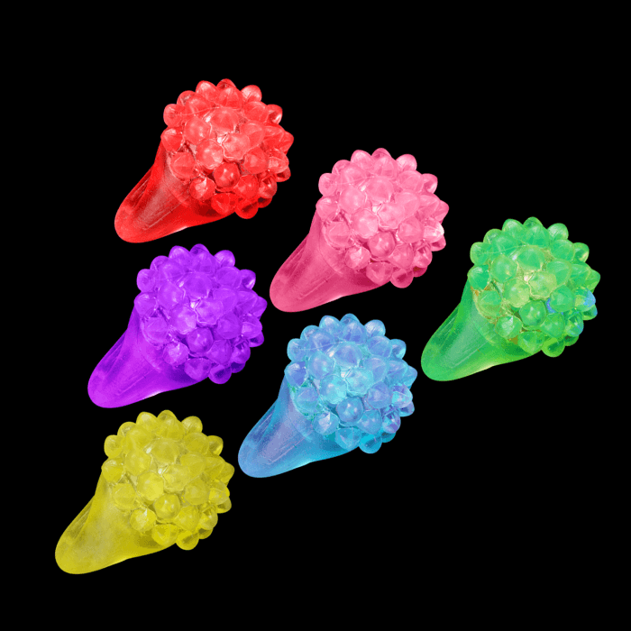 - LED flashing bumpy rings come with bright red, blue and white LED which can be turned on with just a squeeze